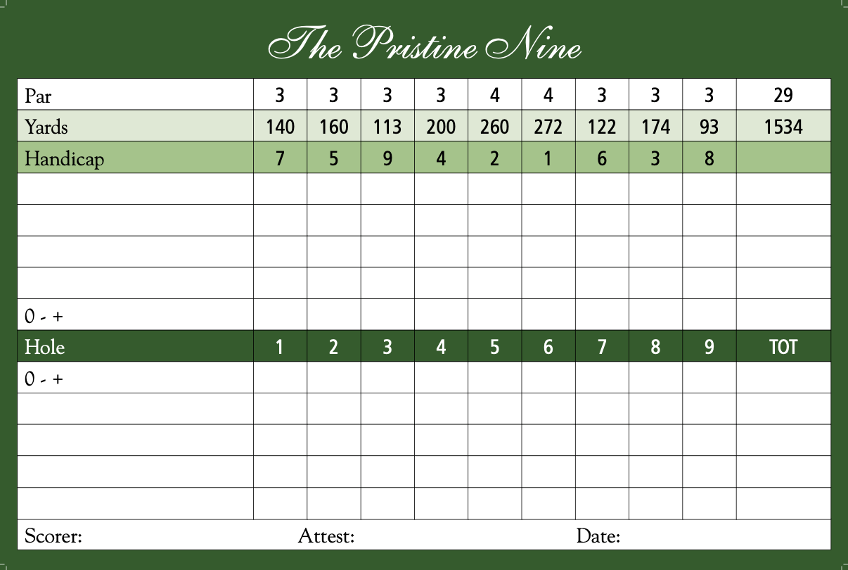 A little slice of golf heaven with 7 par 3's and 2 par 4's. The par threes range from 90 to 200 yards in length and have small undulating greens while the par 4's are reachable at 260 and 270 yards, eagles are rare, and birdies fly away with frequent three putts. Moose are known to frequent the Pristine 9 as they love to go for a dip on Hole 7 where the tee shot requires a carry over a pond. Typical round takes about an hour and a half so it makes for family fun or a quick getaway for lunch on the run.